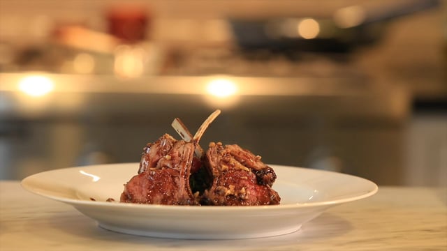 Preheat oven to 400 and season lamb with salt and pepper. Heat olive oil in medium sauté pan and sear. Next, brush lamb with pomegranate molasses, and press chopped pecans on the meat. Roast in oven about 20 minutes for medium rare. While roasting, prepare sauce in original sauté pan. Over low heat, stir together vinegar, sugar, and pomegranate molasses. Allow to simmer and reduce by 1/3.