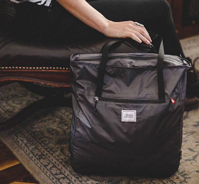 The Transit Tote from Matador is my favorite. It rolls up and fits in a small pouch, is made of leak-proof material, and is strong enough to carry my laptop. And it has a side pocket and zips shut.