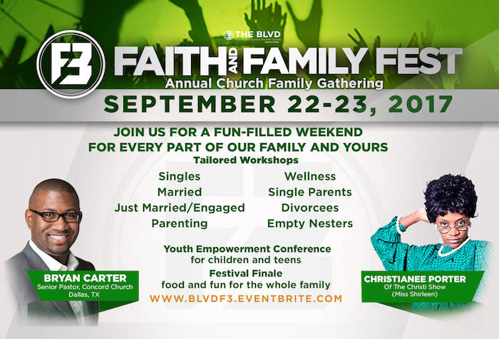 Pastor Bryan Carter of Concord Church in Dallas and Internet sensation, Christianee Porter, best known as Ms. Shirleen, are special guests. The weekend culminates with an outdoor festival for the whole family. RSVP here.