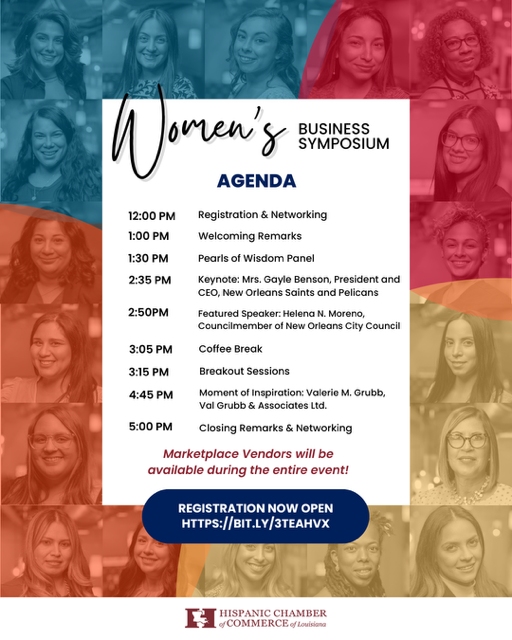 The Hispanic Chamber of Commerce of Louisiana announces our 2024 Women’s Business Symposium on Friday, May 10 at the Four Seasons New Orleans! Featuring keynote speaker Mrs. Gayle Benson, president and CEO of the New Orleans Saints and Pelicans, along with Councilwoman Helena Moreno as our featured speaker and Valerie M. Grubb of Val Grubb & Associates Ltd. as our moment of inspiration speaker.