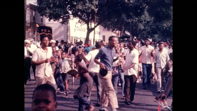 This 1966 footage illustrates components in the funeral procession for trumpeter Avery “Kid” Howard (b. 1908). First, a slow dirge is played on the somber walk to Howard’s grave and continues while the body is interred. Then, the music turns upbeat on the way from the cemetery, drawing a “second line” of outside participants.