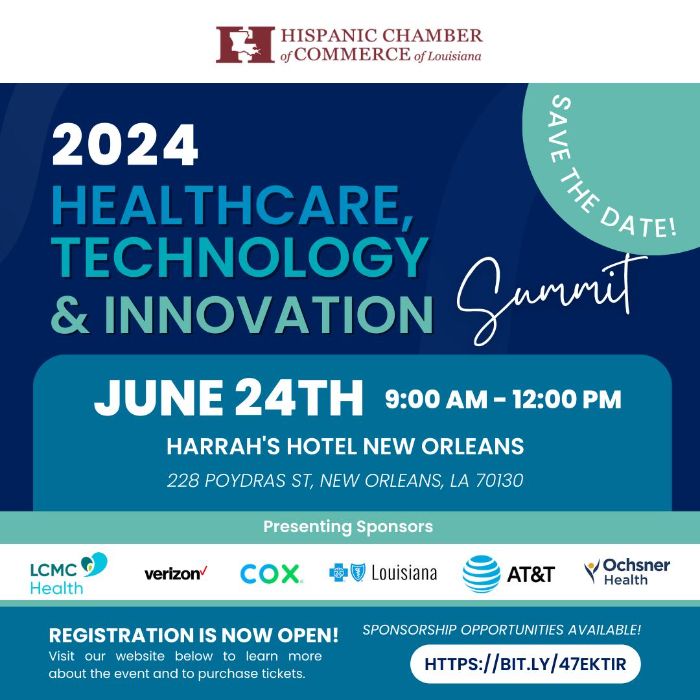 The Hispanic Chamber of Commerce of Louisiana is excited to announce the 2024 Healthcare Technology and Innovation Summit on June 24 from 9-11:30 a.m. at Harrah’s Hotel in New Orleans. We’re honored to welcome Dr. Jason Hill, clinical innovation officer at Ochsner Health, as our keynote speaker.