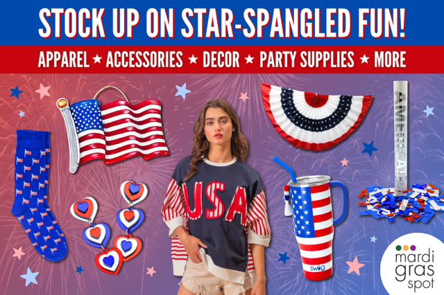 Get ready for July 4 festivities with everything you need from Plush Appeal – The Mardi Gras Spot! Save big on patriotic apparel – select styles are on sale now for up to 45% off! Our red, white and blue collection includes festive clothing, accessories, jewelry, party supplies, tableware, decor and lots more to make your celebration sparkle and shine.