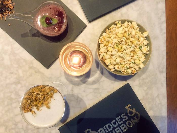 Bridges & Bourbon presents a small plates menu as well to accompany the drinks. We suggest the truffle popcorn, as it pairs perfectly with floral and smokier flavors. Bottoms up!