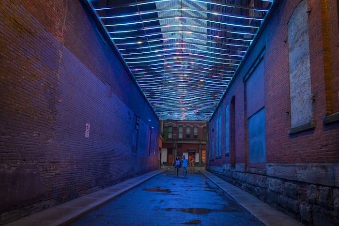 “Garrison Canal,” installed in Garrison Place by artist Andrea Polli, is an imaginary underwater future world of big data. Visitors “swim” below a wave of thousands of shimmering lights that transform color and animate in response to real time changes in local weather conditions.